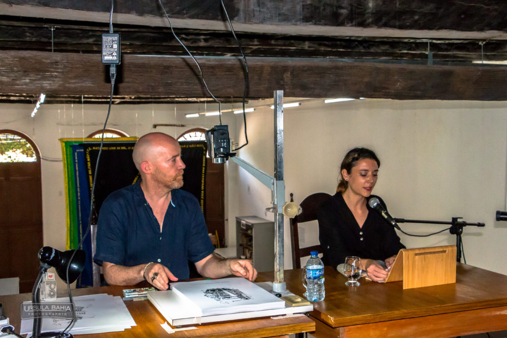 Éric Valette performance La jalousie du plan de manioc/la vengeance du bois qui pleure. (avec Maiwenn Le Nedellec). Dessins, micro, caméra, écran, comédienne. 35 mn environ. © Ursula Bahia