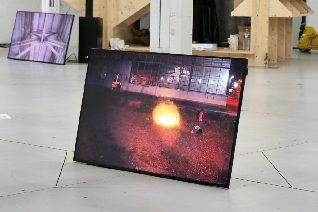 Marcel Dinahet, au premier plan : Arrivée de nuit, vidéo sonore, 12 mn. À l’arrière plan, Tourner l’usine à Fordlândia, vidéo sonore, 3 mn. Écrans plats posés au sol.