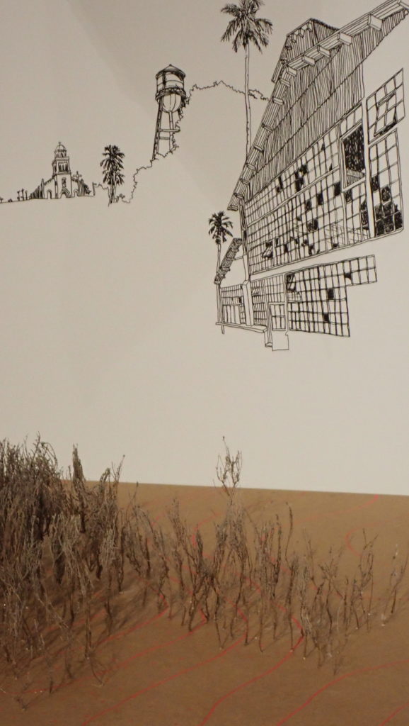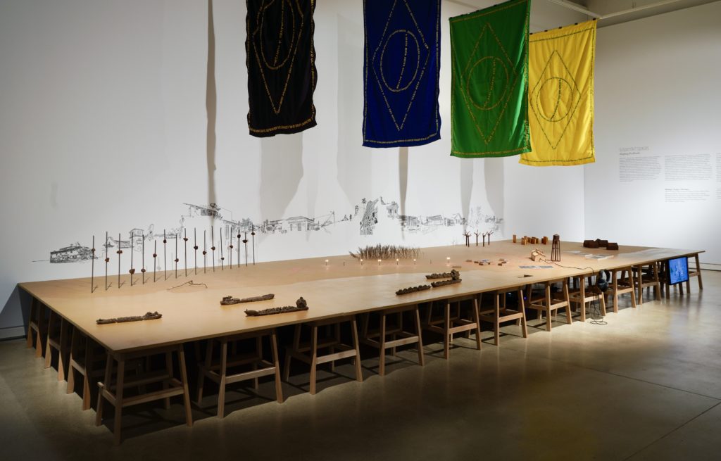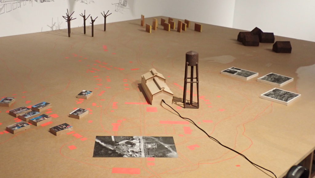 Vue d’ensemble. Plateau de 8 m x 3, divers médium (son, lumière, maquettes, dessin de la carte, dessin au mur, multiple, drapeaux, etc.). Jean Claude Chianale et Suspended spaces.